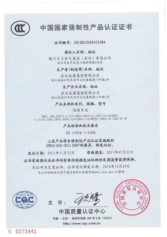 MRGL-400隔離開關(guān)資質(zhì)證書