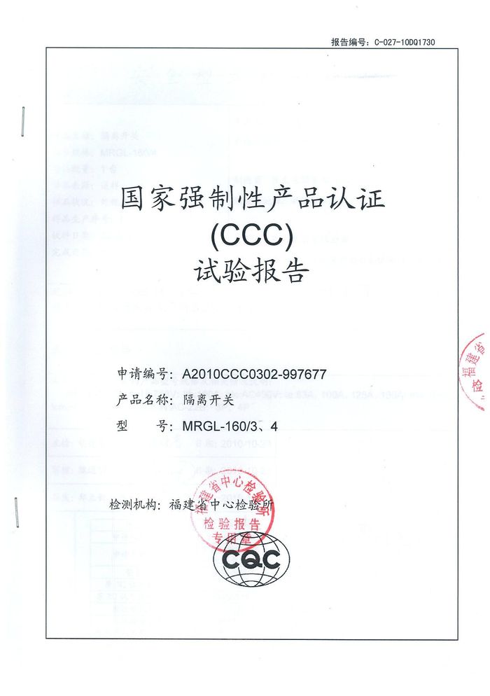 MRGL-160隔離開關(guān)資質(zhì)證書