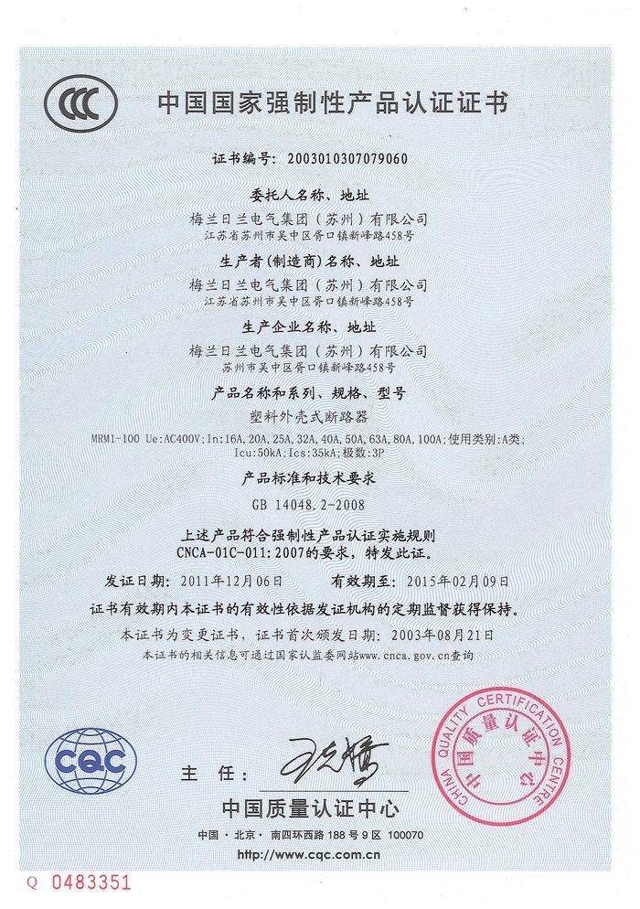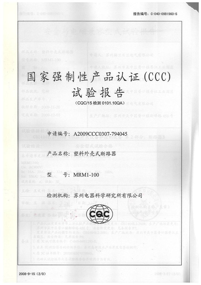 MRM1-100塑殼斷路器資質(zhì)證書