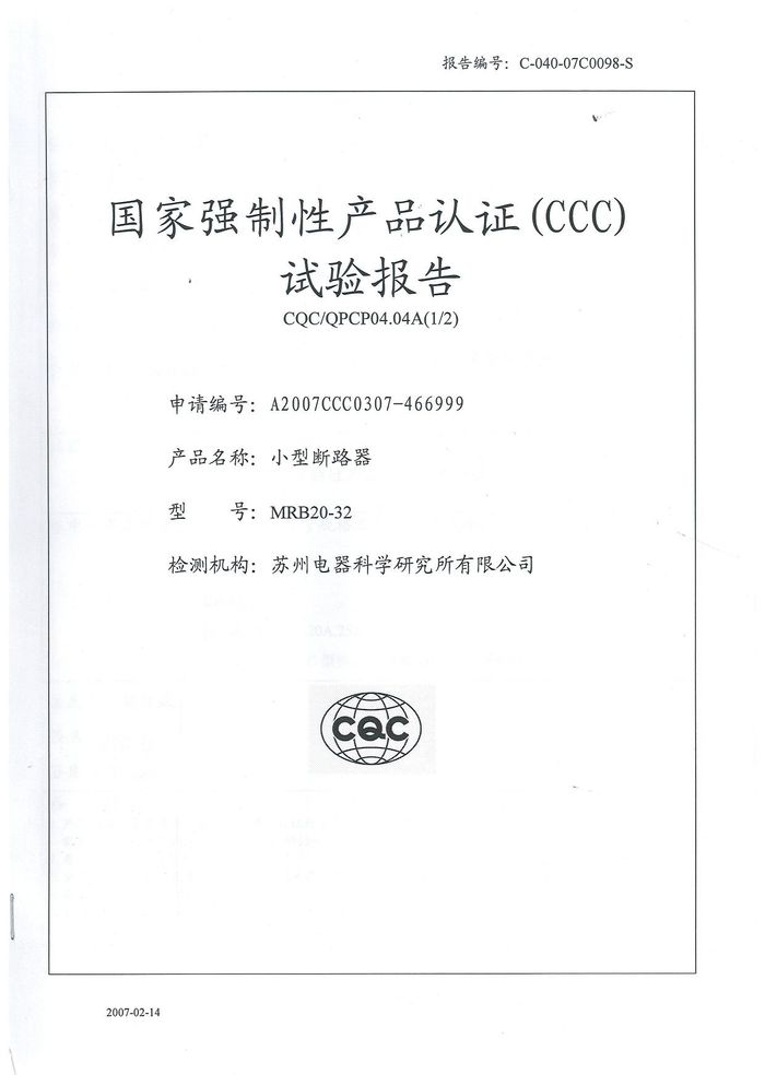 MRB20-32小型斷路器資質(zhì)證書(shū)