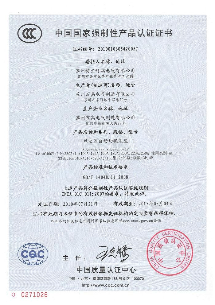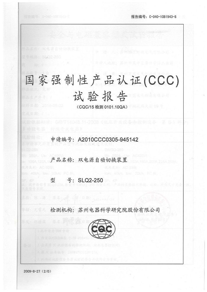 SLQ2-250雙電源資質證書