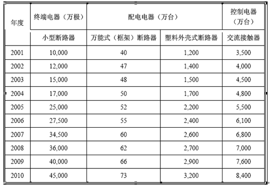 2001-2010年低壓電器主要代表性元件產(chǎn)量
