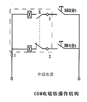 CDM電磁鐵操作機構(gòu)(配用MRMl-63,100,225)接線圖見下圖(虛框內(nèi)為斷路器外符號說明:SBi、SB2操作按鈕(用戶自備)