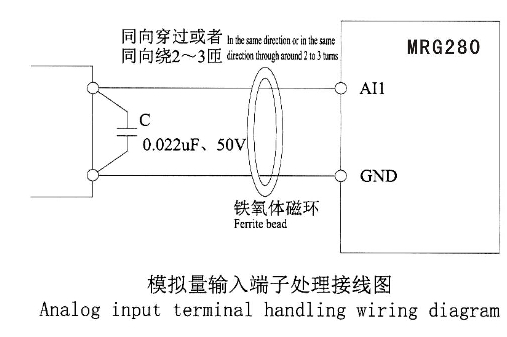 在某些模擬信號(hào)受到嚴(yán)重干擾的場合,模擬信號(hào)源側(cè)需加濾波電器或鐵氧體磁芯,如下圖