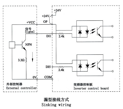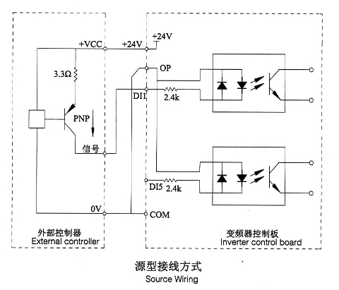 這是一種最常用的接線方式。如果使用外部電源,必須把+24V與OP間的短接片去掉,把外部電源的24V正極接在OP端子,外部電源OV經(jīng)控制器控制觸點(diǎn)后接到相應(yīng)的Dl端子。