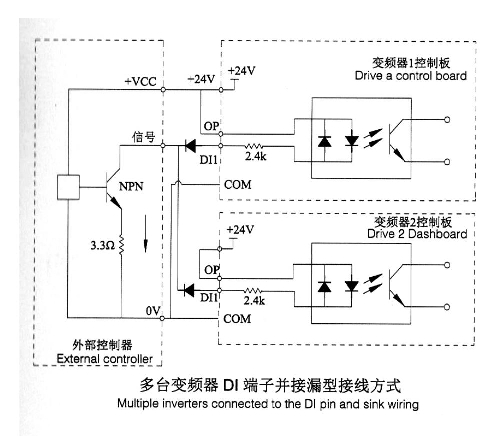 注意:此種接線方式,下同變頻器的Dl端子不能并接使用,否則可能引起Dl的誤動(dòng)作;若需Dl端子并接(不同變頻器之間),則需在Dl端子處串接二吸管(陽極接Dl)使用,二極管需滿足;IF>lOmA、UF<1V,如下圖。