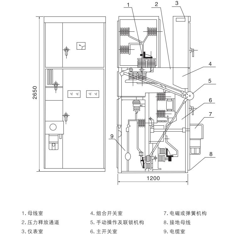 本開關(guān)柜為金屬封閉箱型結(jié)構(gòu),柜體骨架由角鋼焊接而成.柜內(nèi)用鋼板分隔成斷路器室,母線室,電纜室,繼電器室,并可通過(guò)門面上的觀察窗和照明燈觀察柜內(nèi)各主要元件的運(yùn)行情況。為提高開關(guān)柜的技術(shù)性能,各主要元件進(jìn)行了重新設(shè)計(jì)(如斷路器,旋轉(zhuǎn)式隔離開關(guān)等),根據(jù)柜體布置,繼電器室可安裝繼電器,門上可裝設(shè)信號(hào)繼電器、指示儀表、信號(hào)燈,轉(zhuǎn)換開關(guān)安裝于操作小室。后面為母線室,下面為電纜室,用戶可方便地進(jìn)行接線,前面為斷路器室,方便了開關(guān)柜主開關(guān)的檢修,柜體內(nèi)部機(jī)構(gòu)參見圖1、圖2和產(chǎn)品說(shuō)明書。