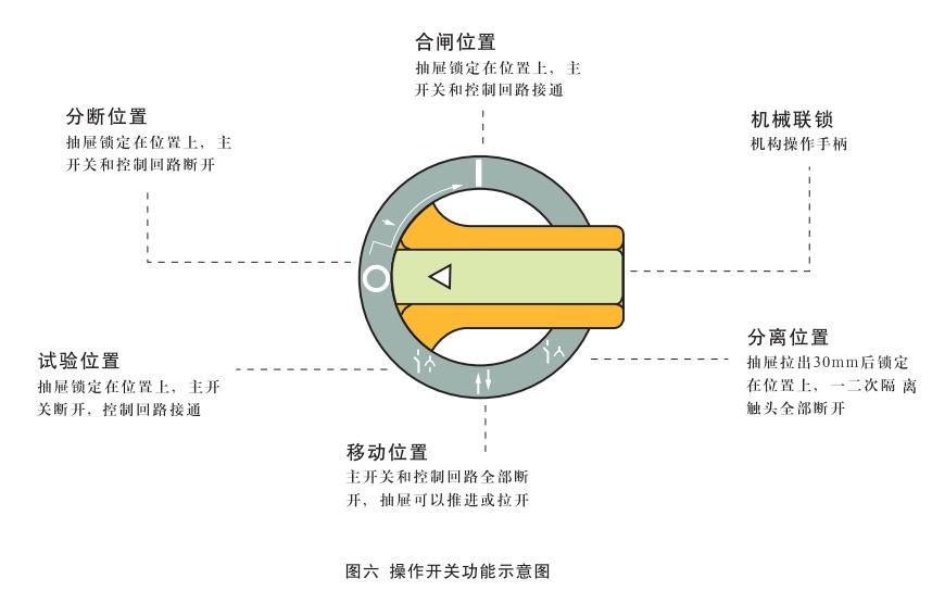 抽屜插入后,將手柄順時(shí)針方向轉(zhuǎn)動(dòng)時(shí),首先到達(dá)“試驗(yàn)位置”(↓),此時(shí)機(jī)構(gòu)將外部電源引入控制回路,用戶通過(guò)面板上的安全電器(假如有的話)對(duì)電路進(jìn)行試操作,以確認(rèn)其是否符合要求,由于主開關(guān)尚處于斷開狀態(tài),因此一次回路處于無(wú)電狀態(tài),即使操作結(jié)果與要求不符也不會(huì)損壞設(shè)備,繼續(xù)順時(shí)針方向轉(zhuǎn)動(dòng)到手柄處于水平位置時(shí),即“分?jǐn)辔恢?rdquo;(0)。此時(shí)一次和二次回路均處于無(wú)電狀態(tài),沿順時(shí)針方向繼續(xù)旋轉(zhuǎn)90°則手柄轉(zhuǎn)到“合閘位置”(I),見圖六。